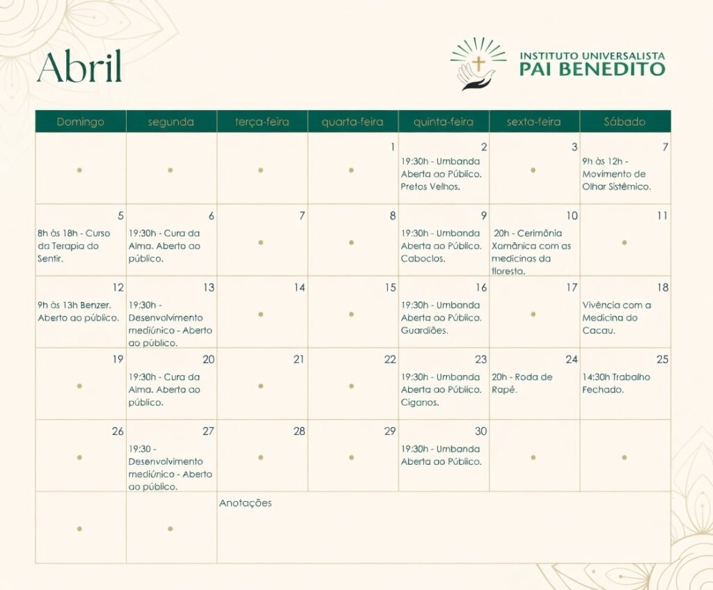 Estas são as atividades do mês de ABRIL de 2026 no Instituto Universalista Pai Benedito. sejam todos muito bem-vindos!